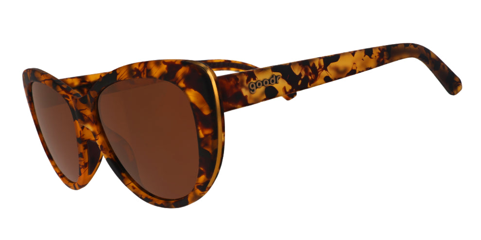ME-OW!!! Take a walk on the wild side in these ferociously fashionable brown tortoiseshell sunglasses with brown non-reflective lenses and gold accents. WARNING: Wearing these frames may result in an uptick of runway catfights due to extreme style envy. Side effects include curling up in cardboard boxes, 3 AM parkour routines, and severe urges to present your butt